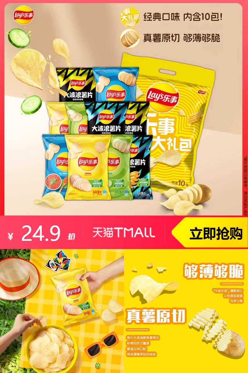 【淘金币抵扣2.68,淘礼金1.74,平台券抵扣1.74,到手价18.74】乐事薯片零食组合400g,香香脆脆,休闲,刷剧吃起来,过瘾!不容错过的休闲零食!口味纯正,够薄够脆,真薯原切,严选土豆!不管是独自品尝的惬意时光,还是和好友共度休闲时刻,400g的大份量总能满足你的味蕾。更重要的是,这款乐事薯片零食组合有着卓越的品质和诱人的价格,让你的每一分钱都物超所值!