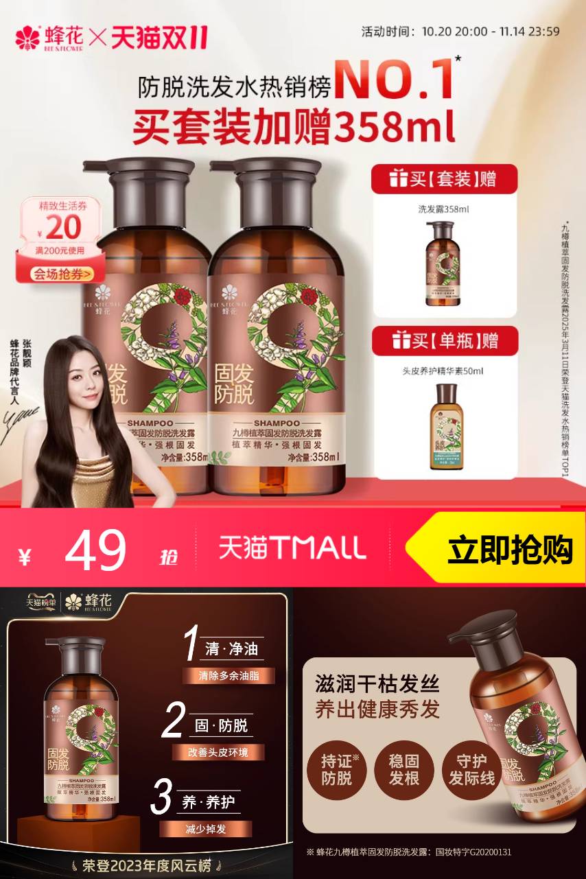 【原价78元,官方立减19元10元券,淘金币抵扣6.24元,限时红包3元,到手39元起,买单瓶赠同款护发素50ml,买套装赠洗发露50ml*2+洗发露8ml*8】蜂花防脱洗发水套装,适合各种发质,无硅油,生姜提取物,深层滋养,强健发根,柔顺健康~