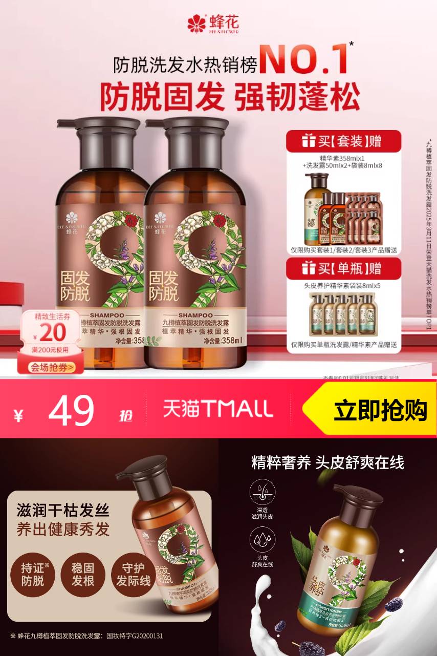 【官方立减19 10元商品券 淘金币抵扣6.28元 消费券抵扣4.8元 限时红包1元到手36元起】蜂花防脱洗发水套装,适合各种发质,无硅油,生姜提取物,深层滋养,强健发根,柔顺健康~