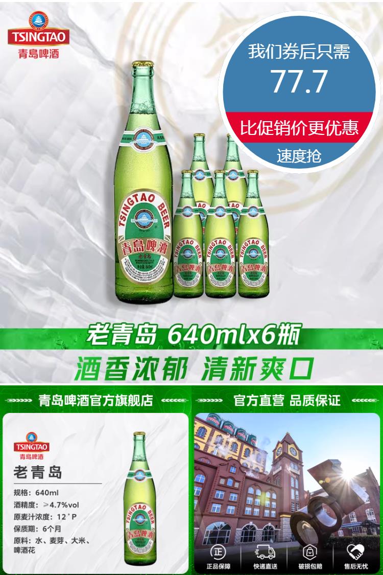 【叠加88会员到手约73.8元】老青岛还是老味道!酒香浓郁清新爽口,经典味道畅销全球,精选优质大麦和就花,采用;两段法低温慢热的工艺,酿造出浓郁独到醇厚的啤酒麦香,入口回味无穷!