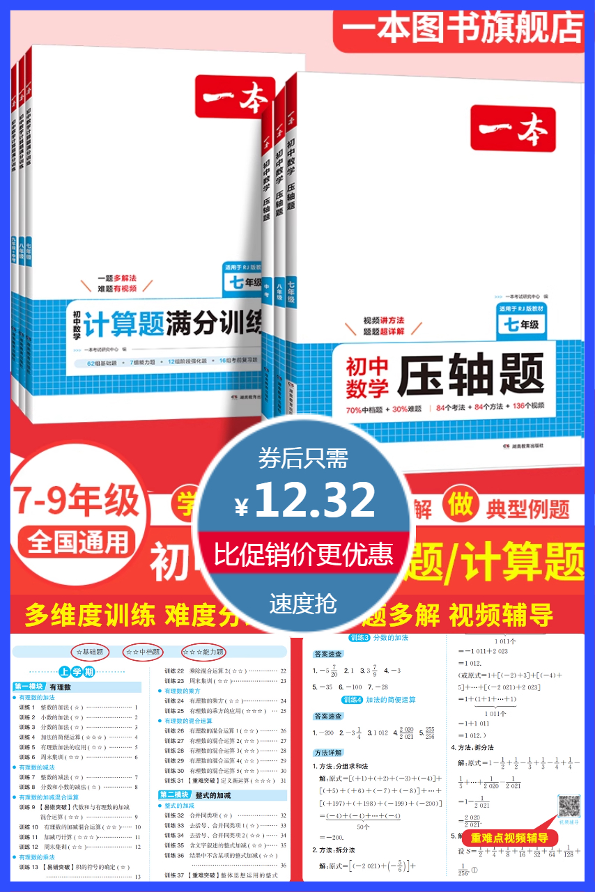 限时补1.48元叠加劵12.32元!一本初中数学计算题满分训练,7-9年级通用,学解题方法,看视频讲解,做典型例题,多维度训练,难度分级,一题多解,视频辅导!