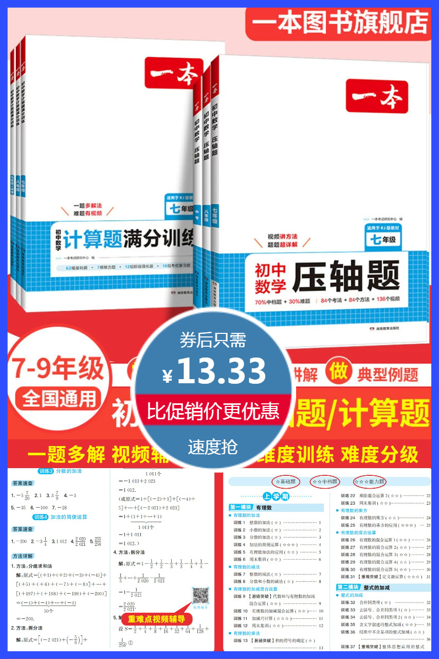 淘金币0.47元凑单叠加劵11元!一本初中数学计算题满分训练,7-9年级通用,学解题方法,看视频讲解,做典型例题,多维度训练,难度分级,一题多解,视频辅导!