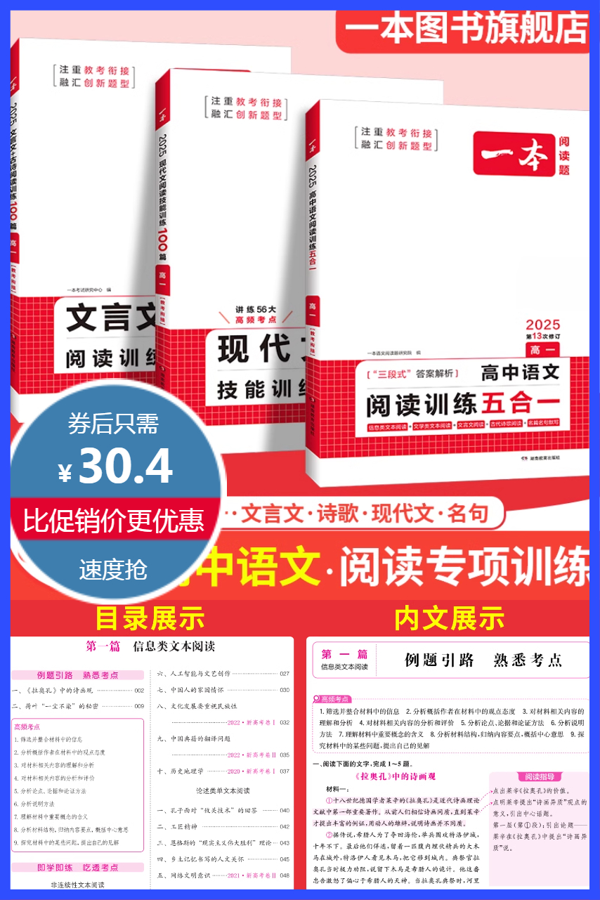 福利包0.15元叠加劵30.25元!一本高中语文阅读训练五合一,紧跟高考改革趋势,系统梳理高频考点,即学即练吃透考点,“三段式”好解析,答案明确得分点,指导规范答题!