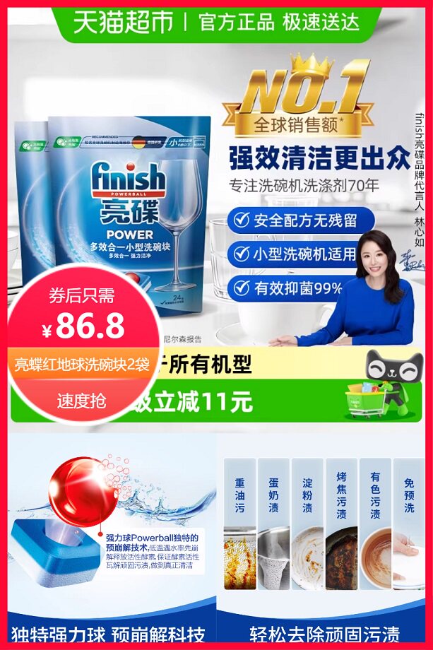 【立减11元+券10元+点击右上角三个点进入淘金币省2元后约86.8元,单袋只需43.4元】finish净享德意生活,强力去污有效去味,洗完难题一块解决,适用于6套以上洗碗机,配方温和安全无残留洗得干净更放心