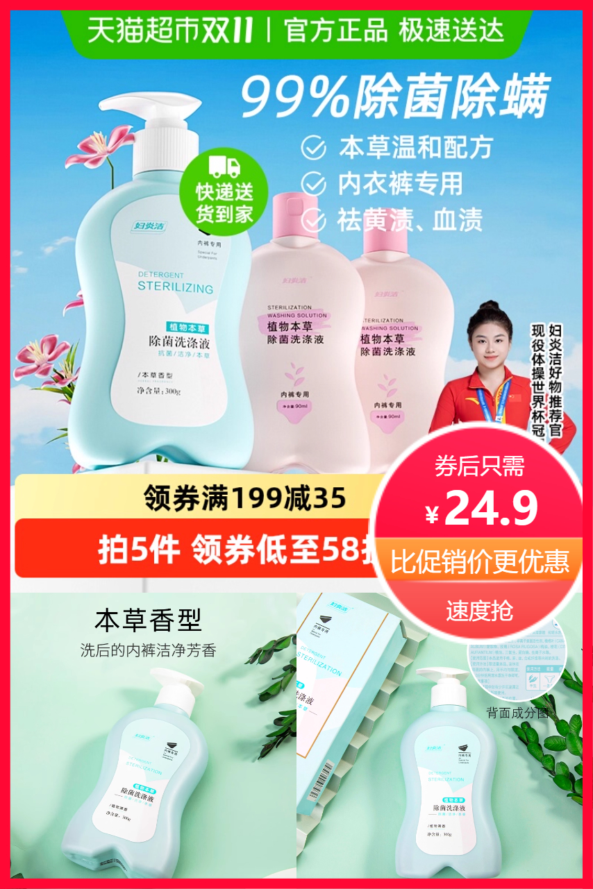 【凑199-35品类券+福袋6元+淘金币+VIP到手10.94,再送90g*2】妇炎洁内裤专用洗衣液香,除菌清洗液内衣去污除血玫绩抑菌,添加橄榄叶提取物,天然精油,温和不刺激,按压头设计,卫生方便!