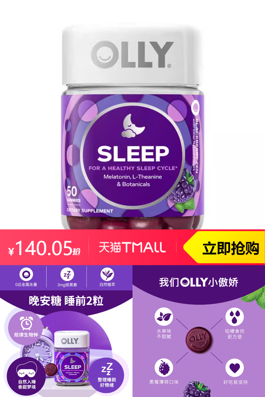 【叠加8.95淘金币到手140.05,凑消费劵到手123.2】OLLY褪黑素软糖晚安瓶助非睡眠片小红书按头安利,压力大睡不着,夜班族时差党,快来试试这款,天染成分,浆果风味,咀嚼吸收高效补充,每天嚼两粒,安睡一整晚!