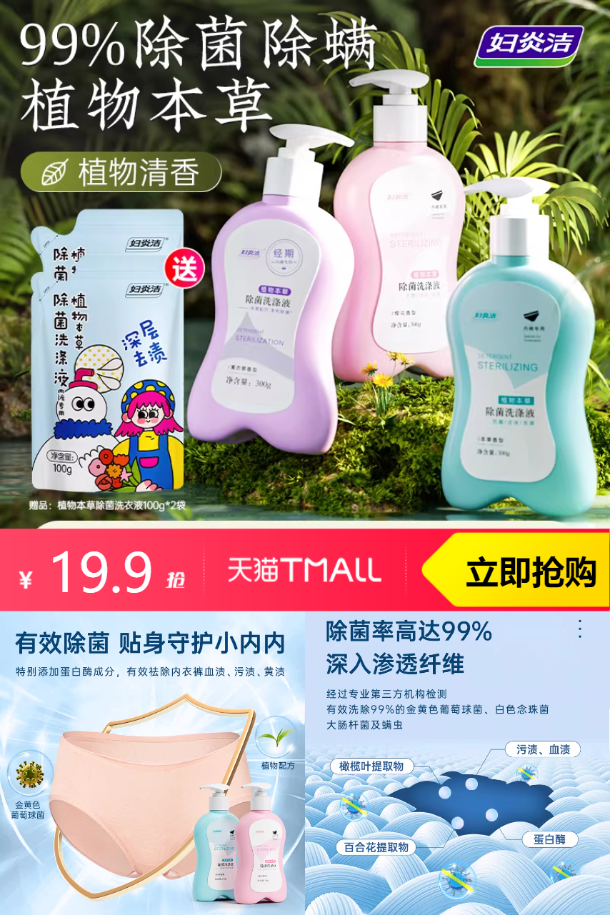 【页面价39.7-券15-立减4.8-88vip95折1-淘金币2.38=16.52元。后37.2%】妇炎洁内裤抑菌洗涤液300g+2袋100,采用天然植物配方,温和不刺激,有效去除异味和细菌~