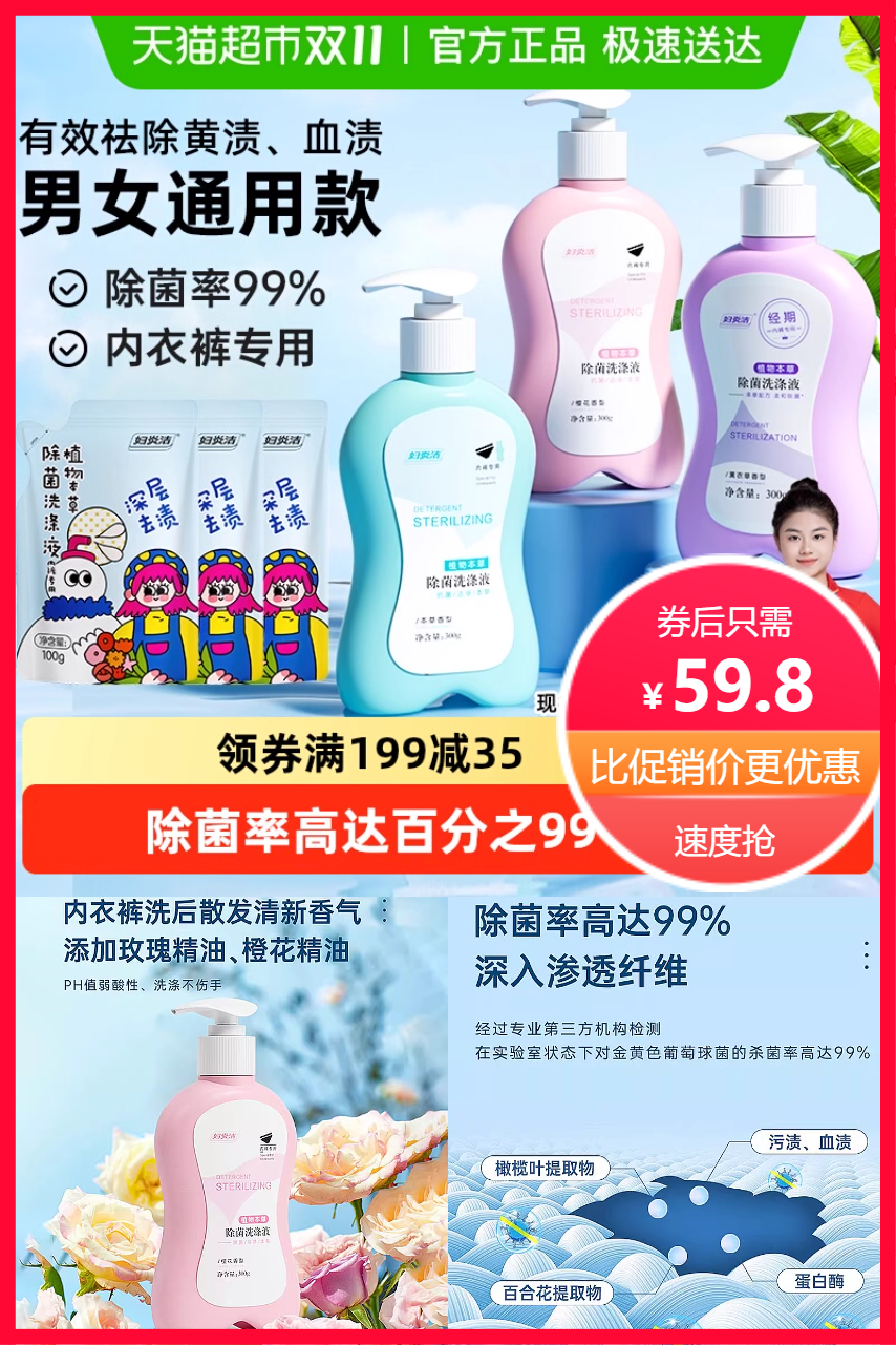 【凑199-35品类券+淘金币+红包8元+VIP到手35.8元,共1200g】妇炎洁内衣内裤专用洗衣液,氨基酸内衣洗衣液,除菌除螨,强效去血渍,温和不刺激,呵护你的健康!