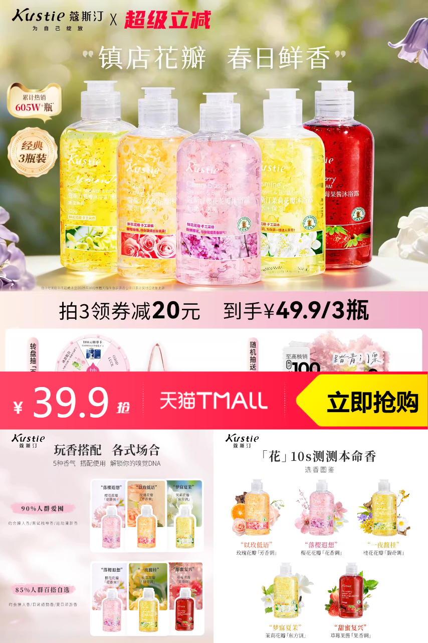 【详情页点淘金币加购拍3,有限时淘金币可以抵扣10.75,叠加淘金币到手29.15(折算9.7一瓶)!】天然花瓣,莹滑肌肤,滋润不紧绷,留香12小时,洗后丝滑透亮~