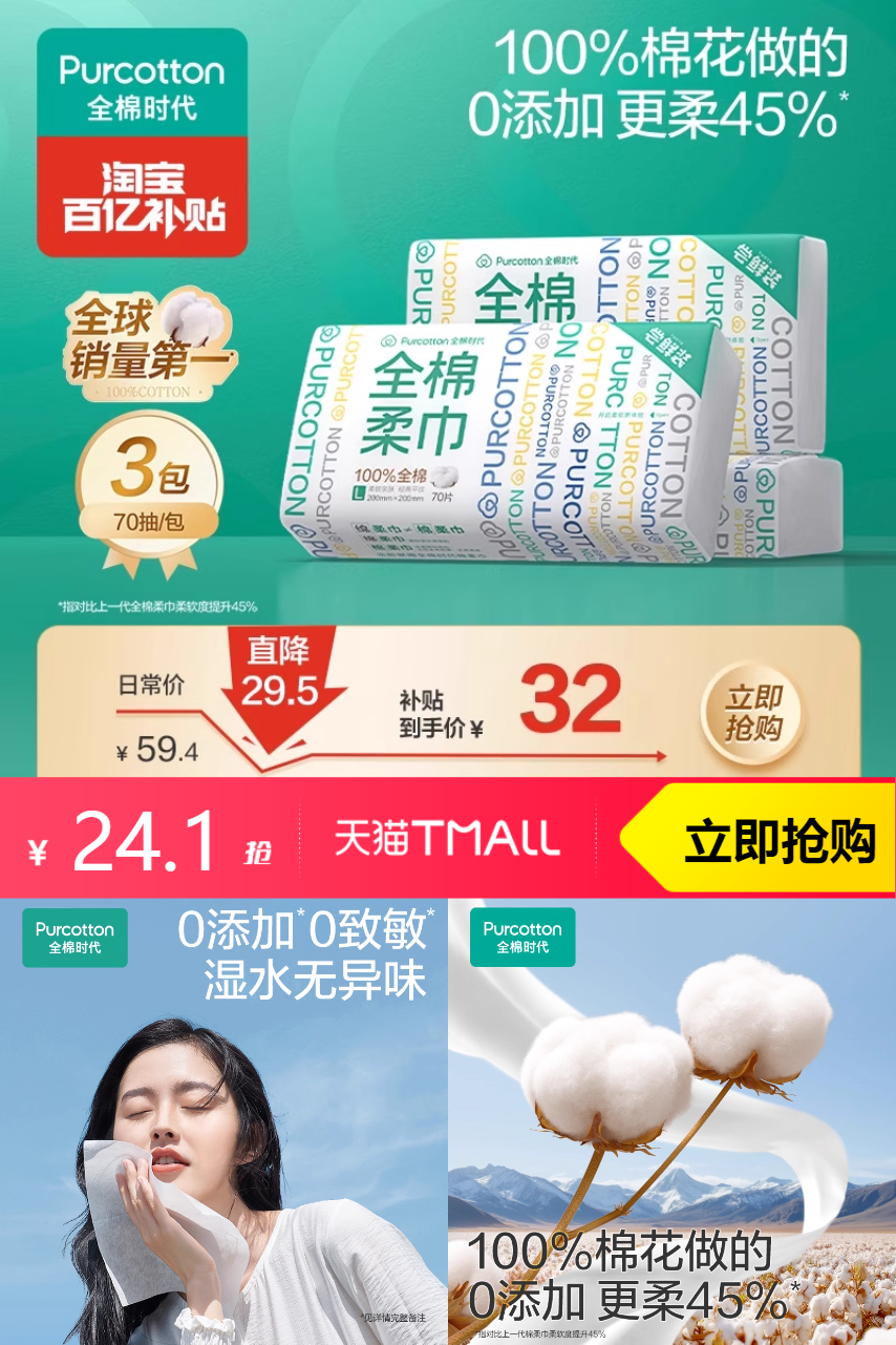 【详情页红包品牌加补4.7元,叠百亿金刚券到手24.1。】全棉材质,温和不刺激,保护你的敏感肌肤~