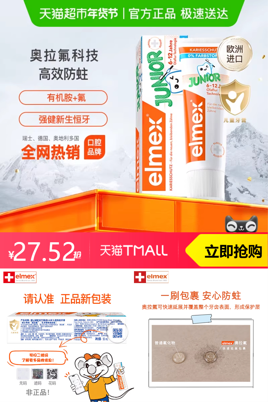 【立减7+淘金币2.38到手27.52+88vip抵扣1.5+消费券抵扣3.25到手22.77】elmex艾美适儿童牙膏为儿童0-6岁,6-12岁换牙期设计,含氟配方科学防蛀,温和不刺激,德国原研品质守护萌牙健康。