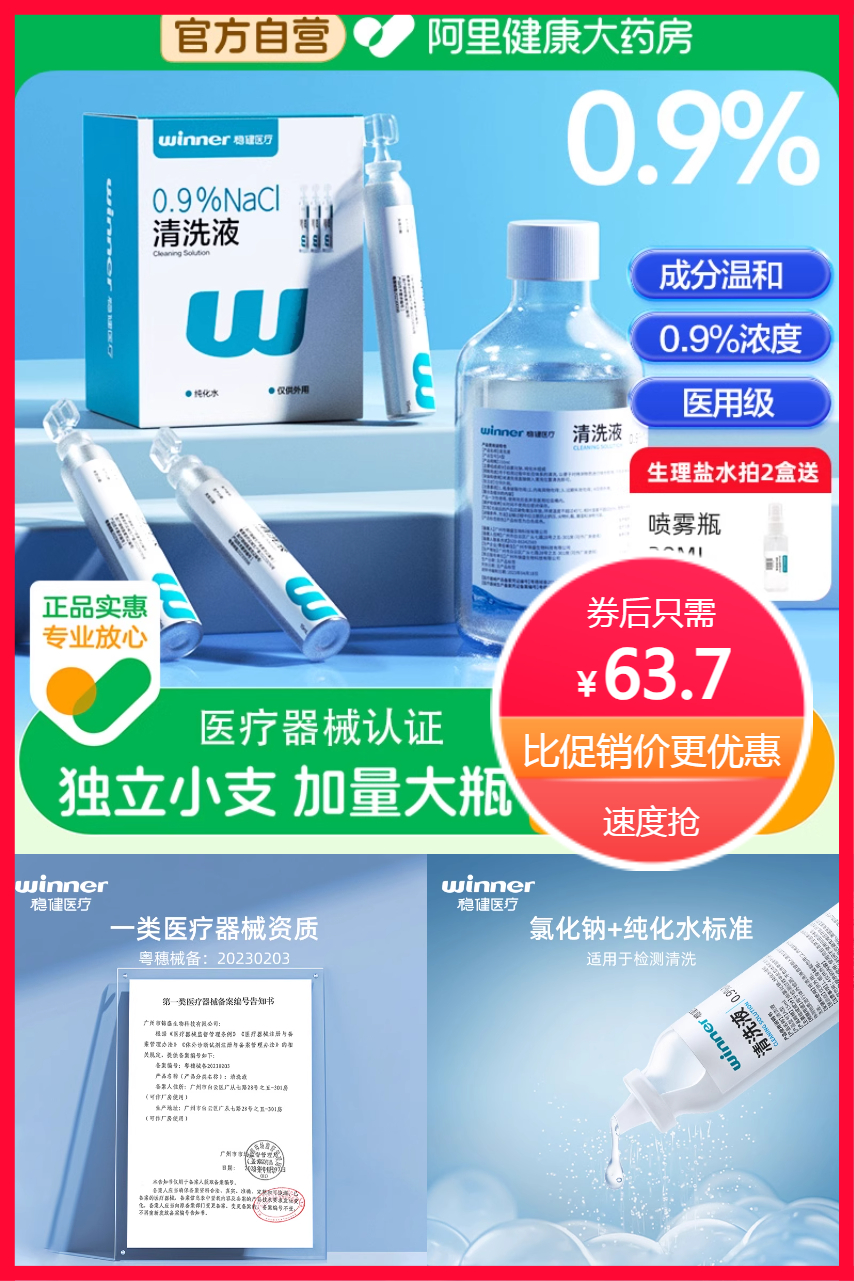【官方立减9.1元+88VIP95折抵扣3.19元+满200减20元到手约48元5盒100支,每支仅要0.48元+赠生理盐水喷雾瓶】稳健医用生理性盐水清洗液,多场景可用,洗鼻洗眼、湿敷痘痘、伤口清洁都适用,百分之0.9医用配方,温和不刺激,5盒100支大容量,性价比超高,便携不浪费,速抢