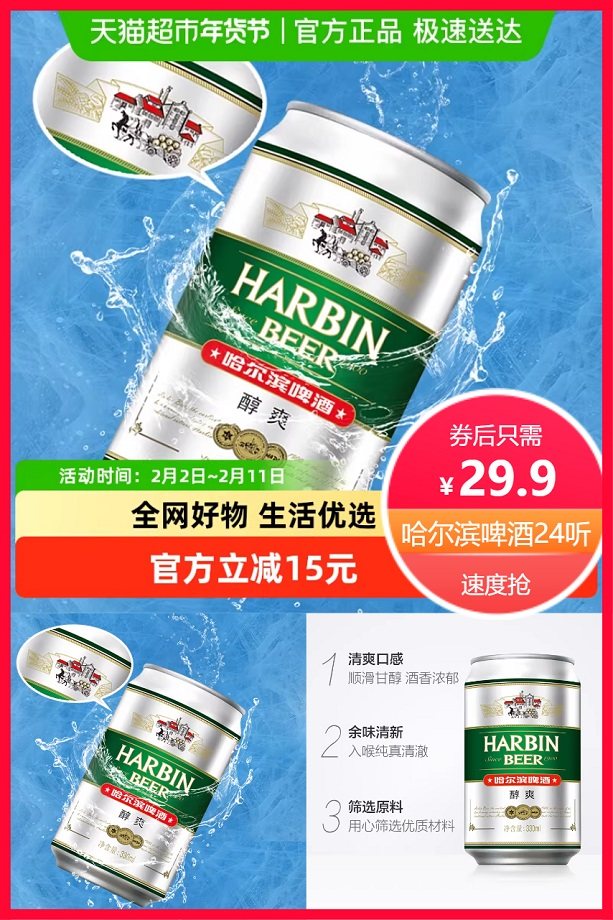 超级立减15元+券5元后约29.9元,哈尔滨哈啤醇爽9度330ml*24听,烧烤、撸串、送礼,聚会好选择!!