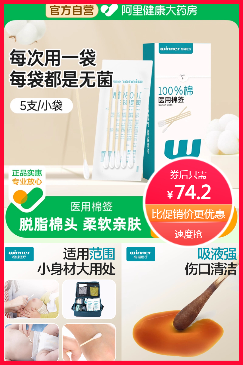 【可签到+88VIP95折抵扣3.71元+1件9折+超级立减9.9元+满200减20元到手约57元10盒1000支】稳健医用大头无菌棉签,械字号认证,灭菌级大容量,医用脱脂棉,柔软亲肤,吸水性强,无菌更安心,专业伤口护理,独立小包装,随身携带方便,干净卫生,速抢