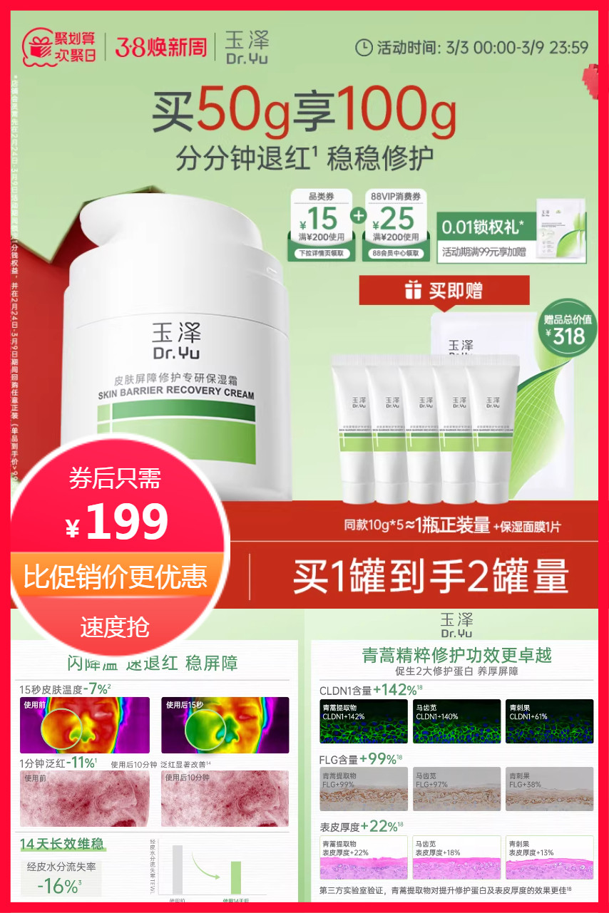 【官方立减32元,88消费券+品类券+88vip到手约165元,赠同款10g*5≈1瓶正装量+保湿面膜1片】玉泽爆款升级!皮肤屏障修护专研面霜!主打修护+保湿,一瓶修护干/热/红/痒/痛, 7天减少敏感反复,双效锁水强韧,14天力证,柔润乳霜质地,丰盈不黏腻,"救急"舒缓,修护屏障,不痒不红~~