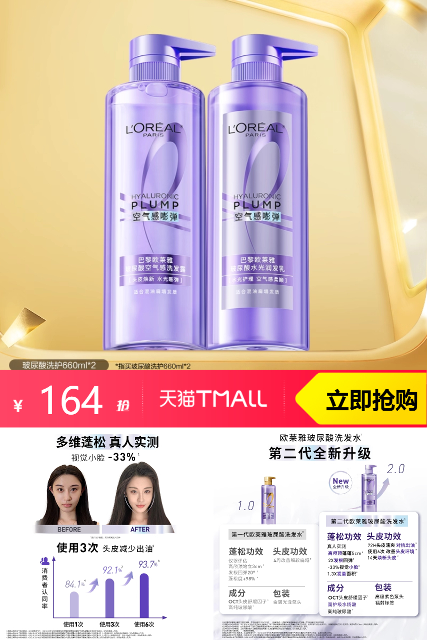 【【1】官方立减24,淘金币抵扣5.94,凑消费券200-25,到手138.31; 【2】详情页先领1分钱权益,享护发素40ml】想要拥有一头清爽蓬松的秀发?试试这款欧莱雅玻尿酸洗发水护发素洗护套装吧!专为解决油腻扁塌问题设计,采用高效控油配方结合玻尿酸成分,深层清洁头皮~