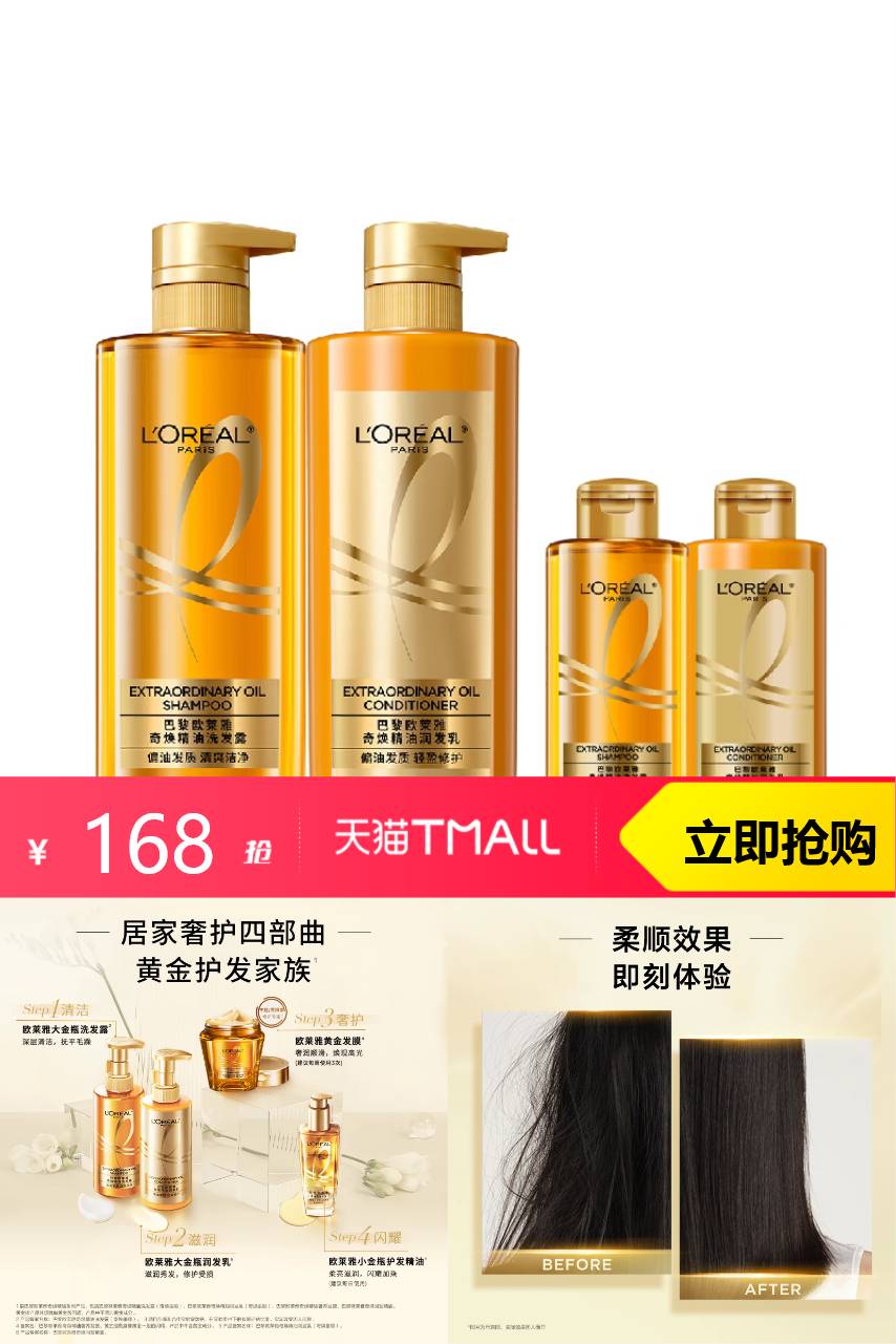 【下拉百补30,淘金币抵扣3元,到手148.2】欧莱雅大金瓶洗护套装,3大珍贵原料,白松露、雪山琥珀和法国玫瑰中萃取高纯度天然精粹油,蕴含天然修护力,干枯稻草发救星,顺到抓不住!!