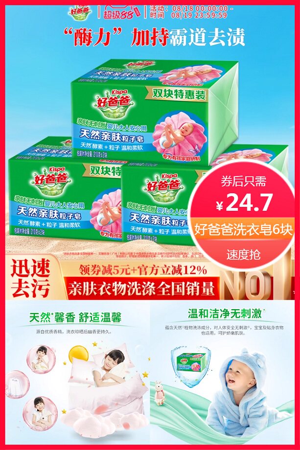 超级立减4.2元+券6元+下拉详情淘金币省1.73元+88vip省1.24元+限时红包3元后约18.73元,立白旗下高端品牌,酶力加持,霸道去渍,祛除顽渍不伤手,温和洁净无残留,专用有孩家族研制,亲肤无刺激,婴儿大人安心用!
