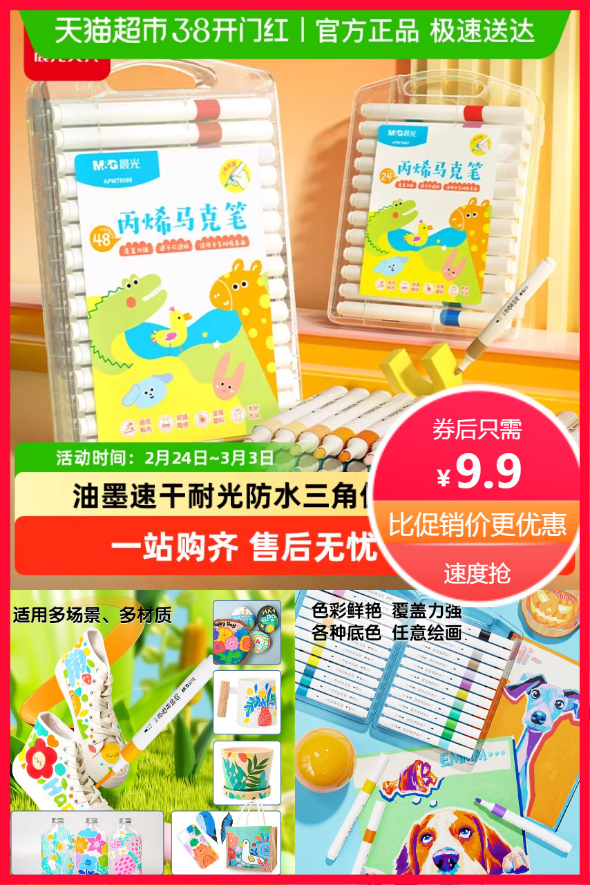 【红包+淘金币+VIP到手约7.11】晨光丙烯马克笔,国家标准,儿童可放心使用,水性墨水,安全无异味,速干油墨,不透纸张,不易晕色,耐光防水,适用多场景、多材质,色彩鲜艳,覆盖力强,各种底色,任意绘画!