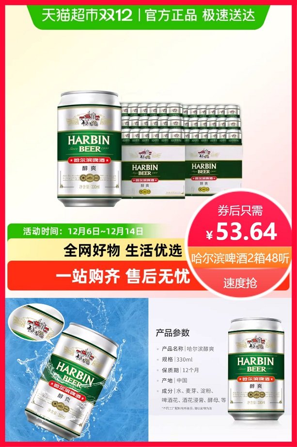 点击右上角三个点进入淘金币省3元+超级立减30元+券20元+淘礼金省2.36后约53.64元,单箱26.8元,哈尔滨哈啤醇爽9度330ml*24听*2箱,烧烤、撸串、送礼,聚会好选择!!