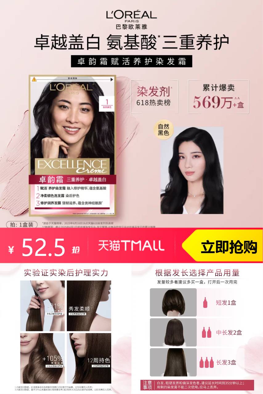 【拍3件7.7折,官方立减25.2,淘金币抵扣3.88元,凑消费券200-25,到手101.7,33.9/盒】不漂也出色,自己在家轻松get潮色!沙龙灵感,洁净头皮,染后立即护色,在家染发,也能像沙龙一样出色!欧莱雅美发卓韵霜染发剂!高显色,持色8周不泛黄~