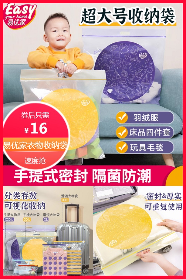 超级立减1.9元后约16元,拍3件送滑索收纳袋25条,手提衣物收纳袋大号四件套,密封厚实,可重复使用【推荐理由】收纳,便携,防潮,防尘,防虫,差旅便携自封袋,家用加厚密封袋,再也不担心受潮啦!!