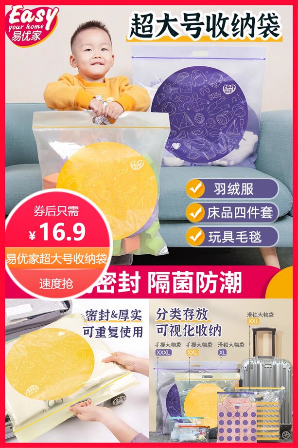 超级立减2元+券1元+淘金币省0.39元+限时红包3元后约13.51元,拍3件送滑索收纳袋25条,手提衣物收纳袋大号四件套,密封厚实,可重复使用【推荐理由】收纳,便携,防潮,防尘,防虫,差旅便携自封袋,家用加厚密封袋,再也不担心受潮啦!!