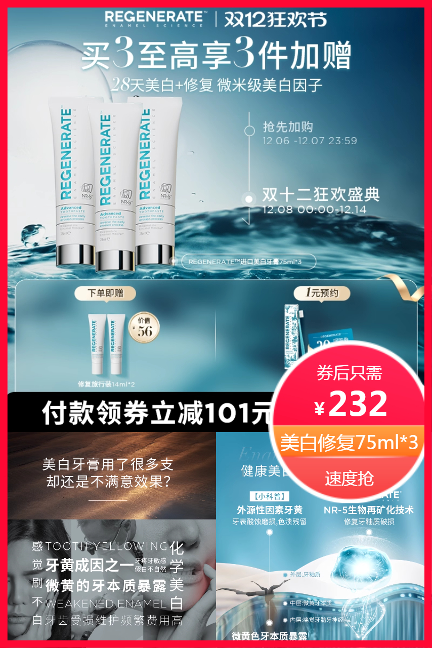 【超立减41元+淘金币15.84元+88vip95折,美白牙膏75ml*3+修复旅行装14ml*2,到手约204元,折/支68元】regenerate进口美白修护牙膏,4周美白+修复,NR-5专利成分重建牙齿保护“屏障”,修复牙釉质;微米级美白因子,有效去除外源性色渍;法式香感,高级特调薄荷香,清新口气~