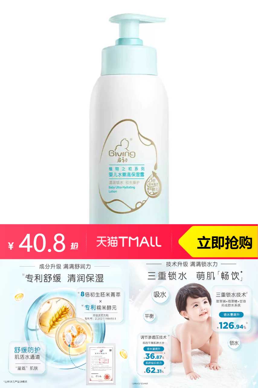 【下单立减10元,淘金币抵扣4.08元,88vip9.5折2.14元,到手34.58】启初婴儿宝宝润肤乳保湿露235ml*2瓶,细心呵护宝宝娇嫩肌肤~