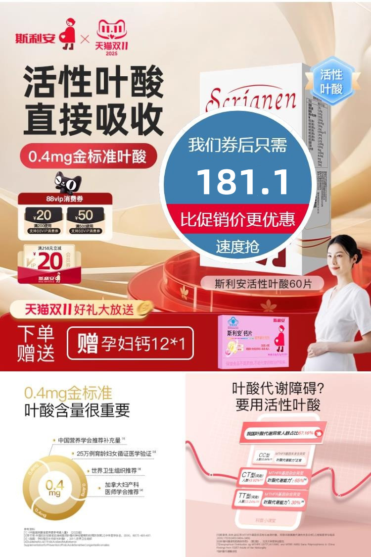 【官方立减+88VIP+消费券+淘金币!赠孕妇钙*1】金斯利安活性叶酸片,0.4mg金标准含量,特别添加优势成分,不含碘不加糖,21种营养齐补,省去瓶瓶罐罐,活性叶酸,不挑体质直接吸收!