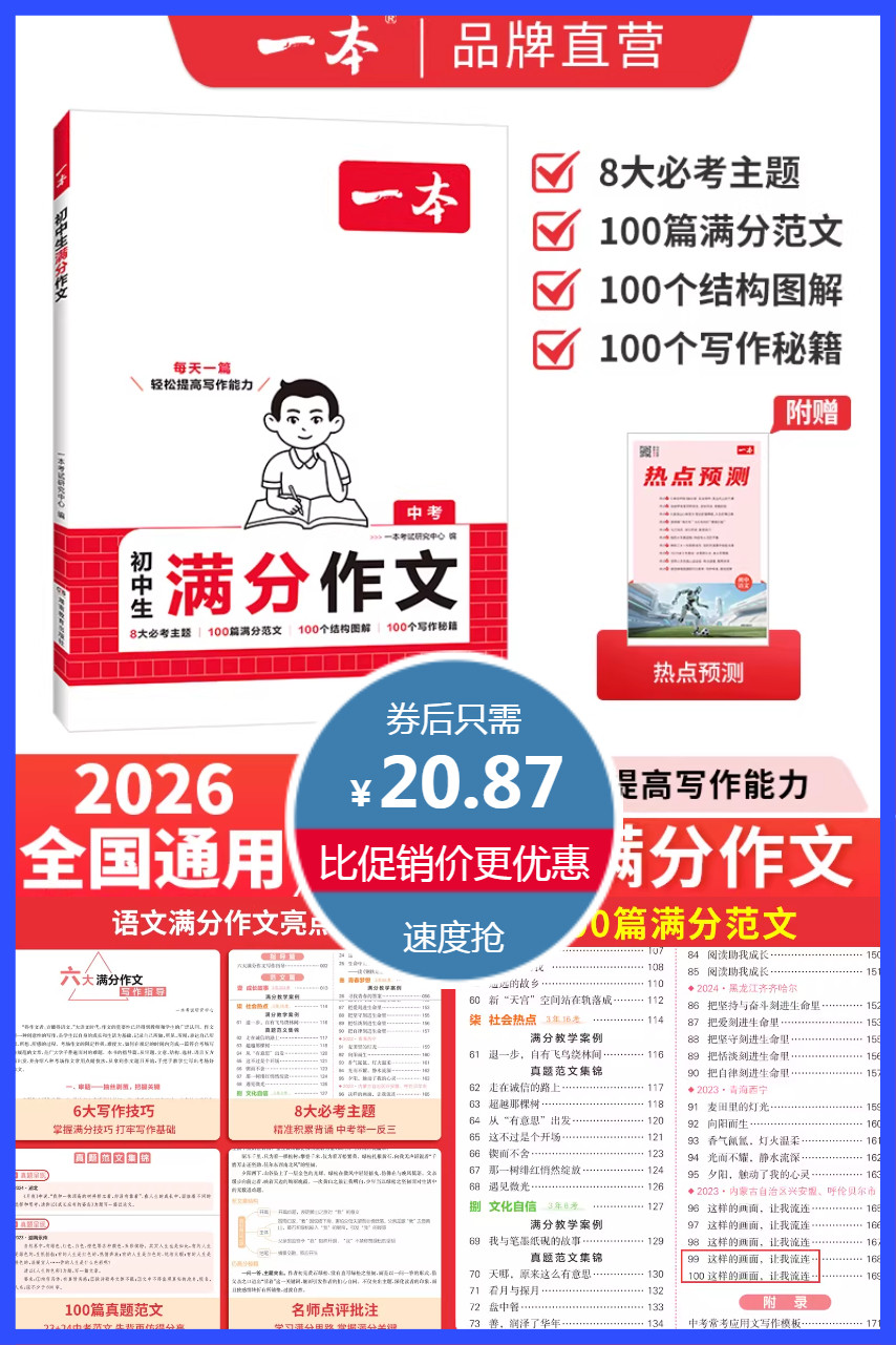 消费劵凑单+淘金币0.73元叠加劵到手约16.5元!送热点预测!一本初中中考通用满分作文,8大必考主题,100篇满分范文,100个结构图解,100个写作秘籍,每天一篇,轻松提高写作能力