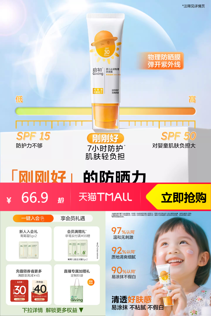 【原价78.8-直降11.9-淘金币7.08-红包3=到手56.82】启初婴儿沁润物理防晒霜宝宝儿童45g,品质优选。