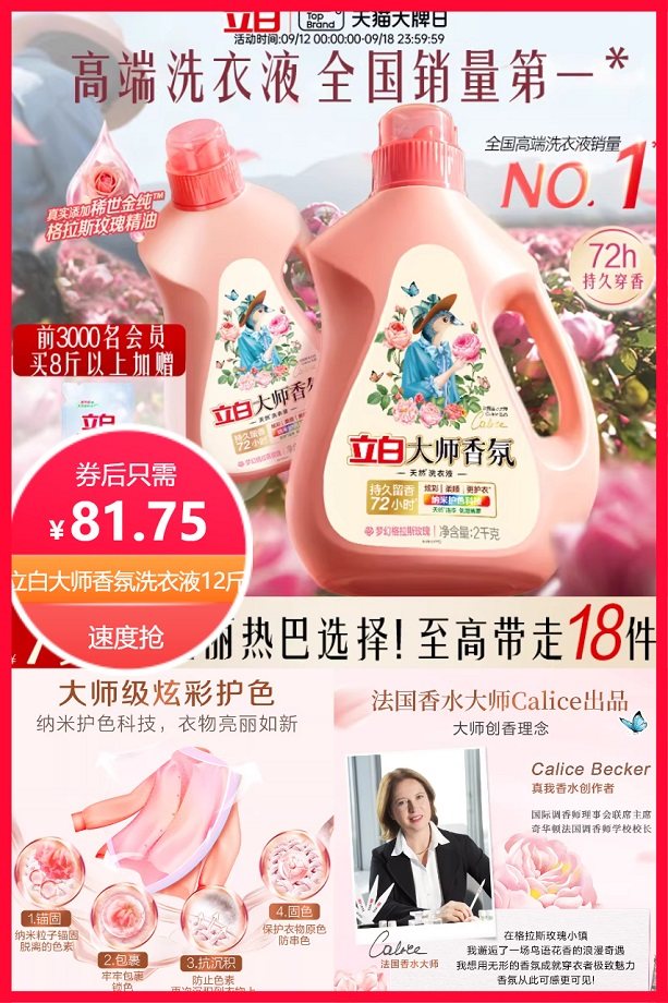 前3千名买就送大师柔顺剂500g*2袋,拍12斤选项,淘礼金4.74元+超级立减14元+券10元+淘金币3.41元+88vip省4.26元+凑单消费券后约67.9元,立白大师香氛香水洗衣液,微胶囊悬浮专利,持久留香72小时,纳米护色科技,炫彩护色,衣服亮丽如新,天然酵素,深层洁净!