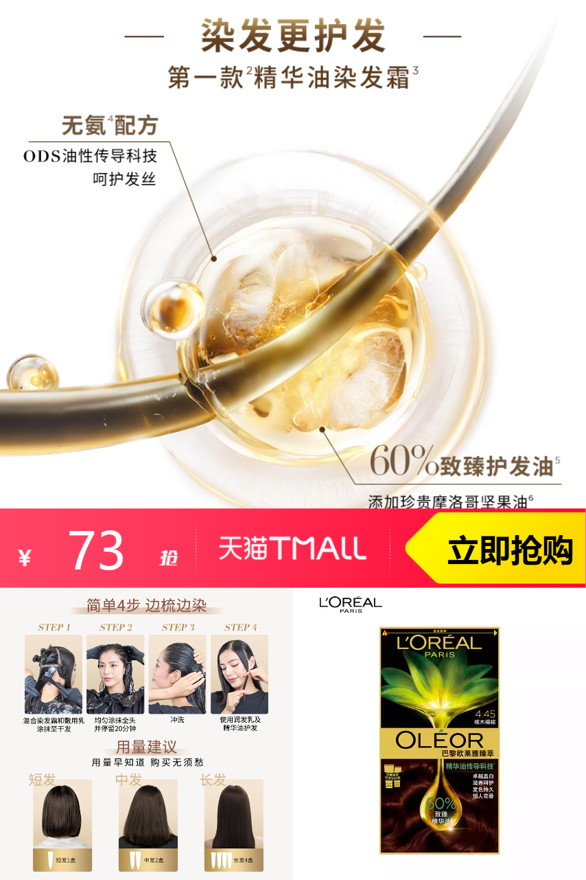 【1】官方立减11,淘金币4.45,凑精致生活券200-15,消费券200-25,到手54.15;【2】建议拍3件,凑消费券到手156.7,52.23/件;【3】提前预约实付60,赠旅行装洗发露100ml。【新年礼物】欧莱雅精油染发霜臻萃染发膏,品质优选。