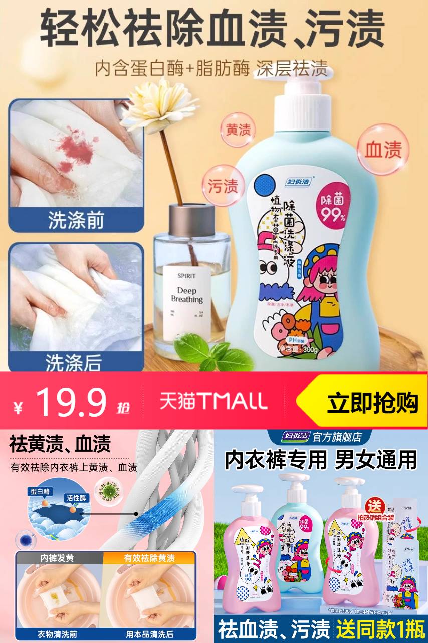 【39.9-直降11券9-淘金币2,38-88vip95折1=16.52元】妇炎洁内裤抑菌洗涤液300g+2袋100,除菌率99%给内衣裤专属“除菌浴"~