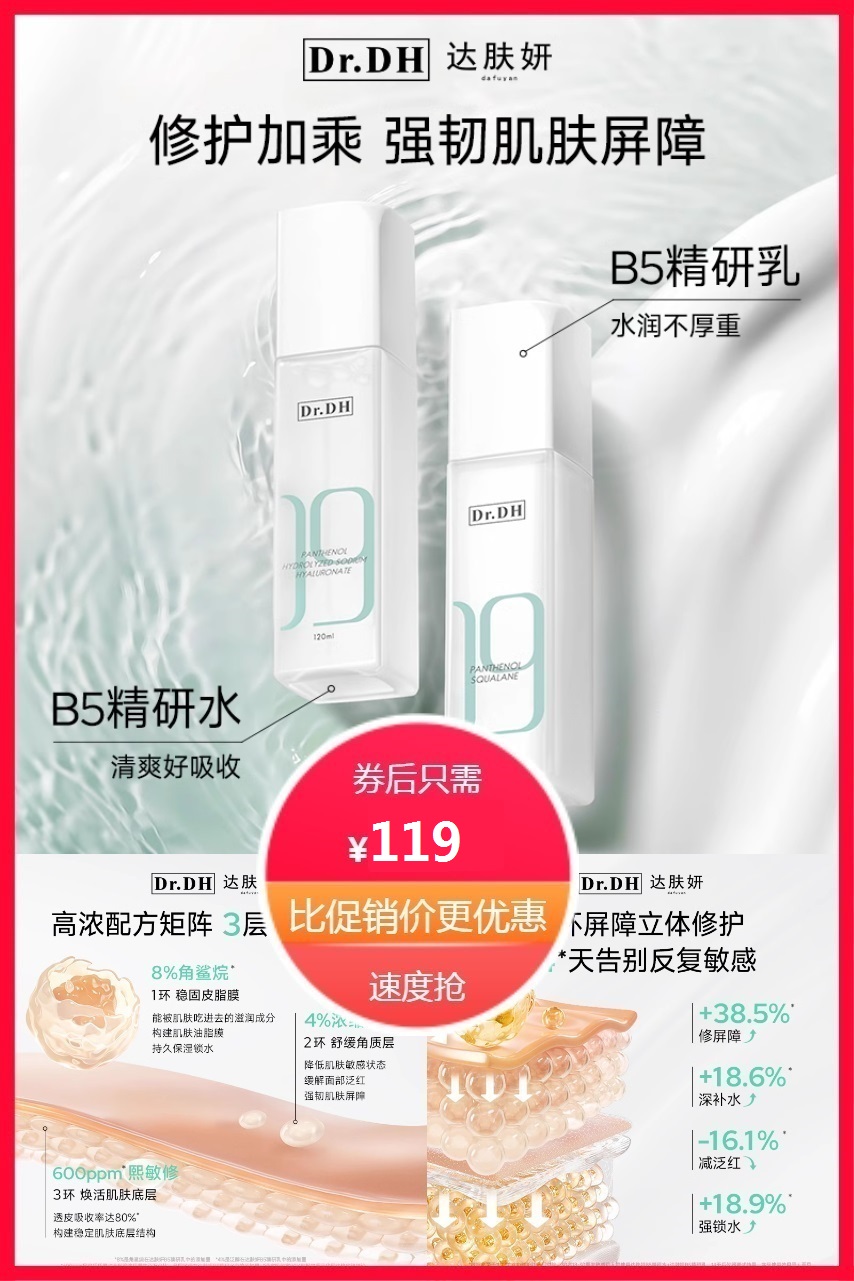 下单即赠B5面膜!一套深源修护,解救干敏泛红。精研水清爽好吸收,精研乳水润不厚重,精简成分,肌肤无负担。