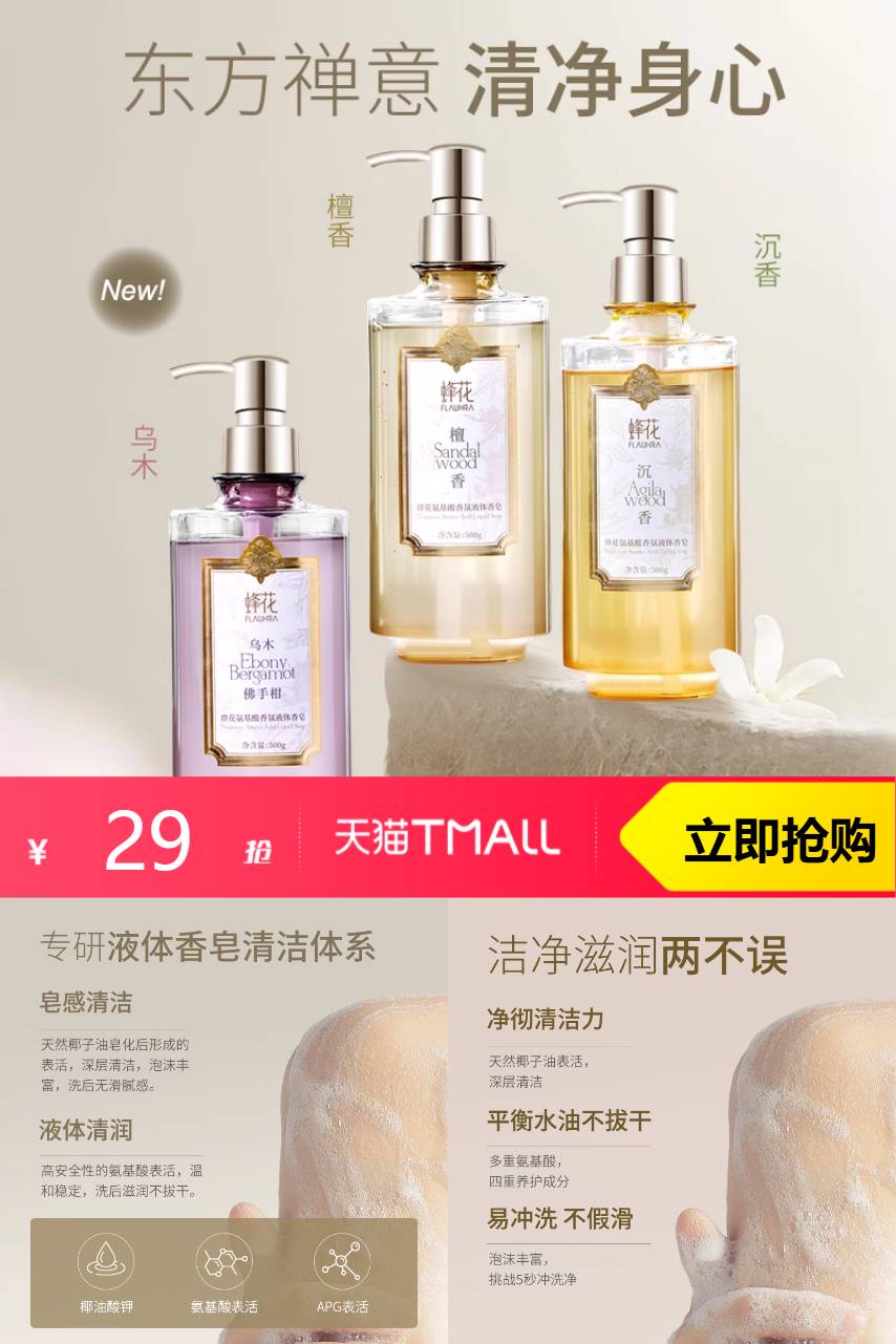【淘金币4.14,叠惊喜消费券750-60,到手22.87】蜂花氨基酸液体香皂檀香香氛沐浴500g,洗净+滋润两不误,蜂花全新升级液体香皂体系~