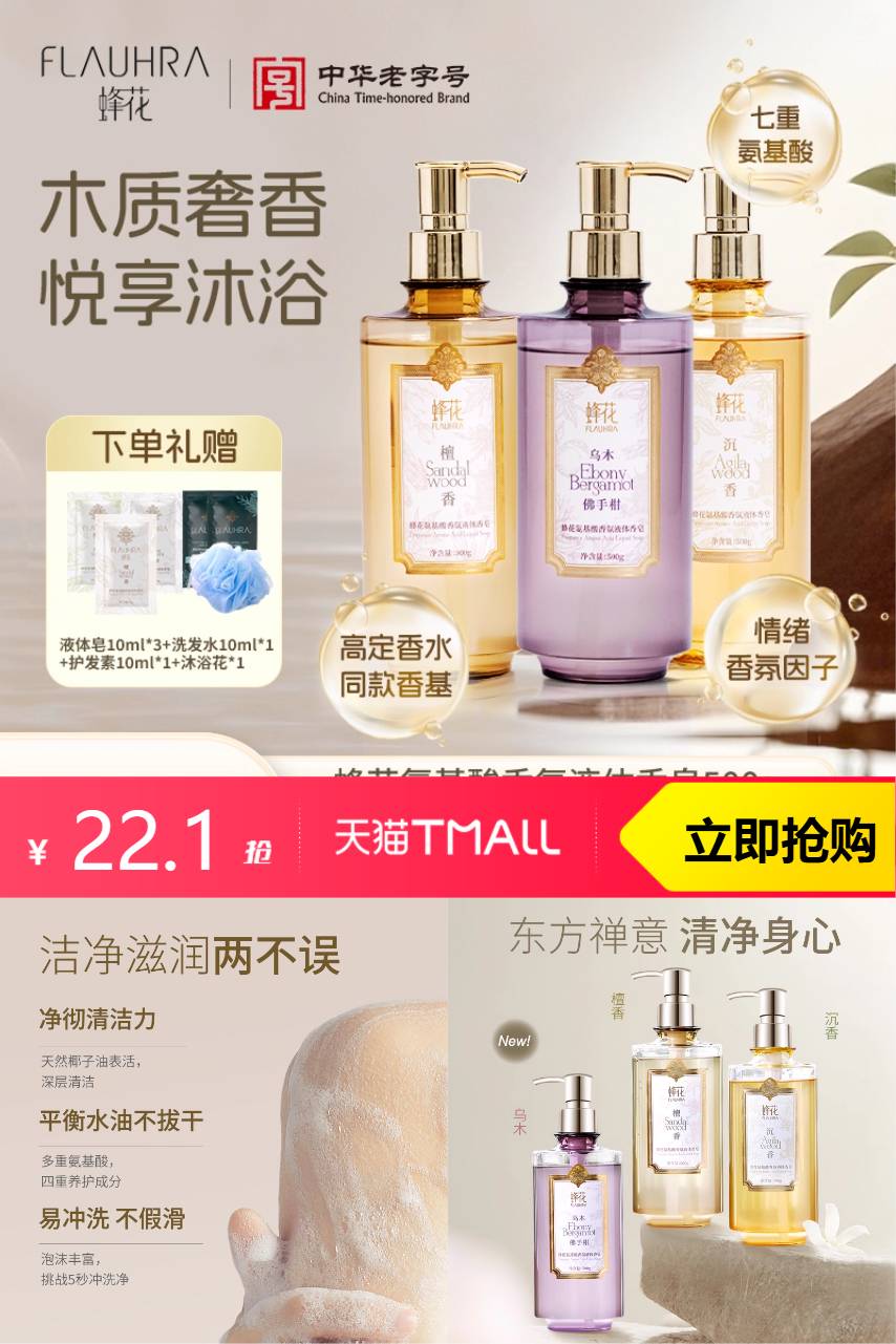 【淘金币2.69,叠88VIP冬焕新消费券200-20,到手18左右】蜂花氨基酸液体香皂檀香香氛沐浴500g,洗净+滋润两不误,蜂花全新升级液体香皂体系~