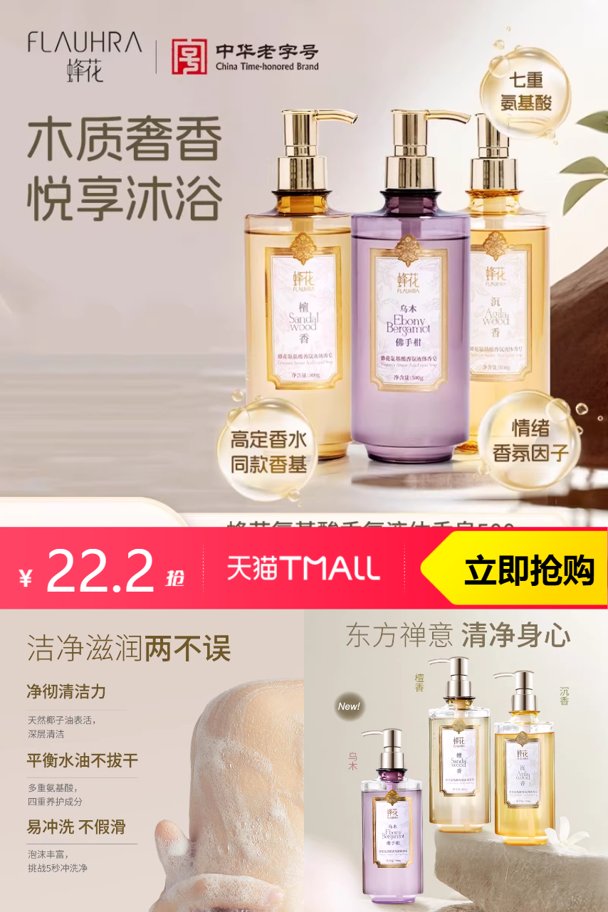 【金币2.4,到手19.8,赠沐浴球1件,试用装1件】蜂花氨基酸液体香皂沐浴500g,超赞~