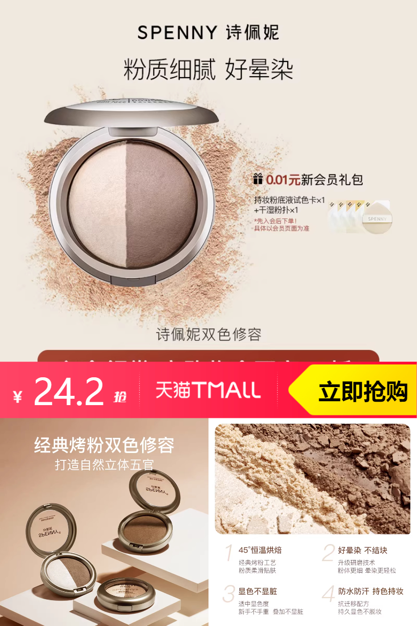 【原价26.7-超级立减2.7-限时红包2-淘金币3.22=到手18.98元。比大促便宜】精心设计的一体盘集修容与高光于一体,将专业的修饰力与简便的步骤完美结合,助你打造精致的五官与细腻的肌肤质感。