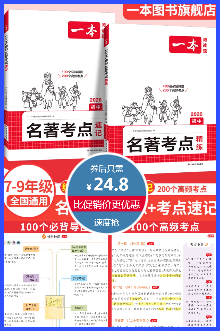赠重点内容大挂图!7-9年级一本初中语文名著考点速记,名著考点精练+考点速记任选,练400道名著必刷题,记200个高频考点,100个必背导图,图文并茂,助记故事情节,41个新题型,紧扣课标,掌握中考热门考法,丰富的趣味漫画孩子更喜欢