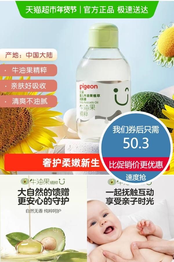 【淘金币+福袋+VIP到手更优惠】Pigeon新生儿牛油果植萃润肤油,升级双重油粹,奢护柔嫩新生,无矿油矿脂,温和更安心,保湿不油腻,添加牛油果*乳木果油成分双重油粹,高保湿滋润,亲肤好吸收,清爽不油腻