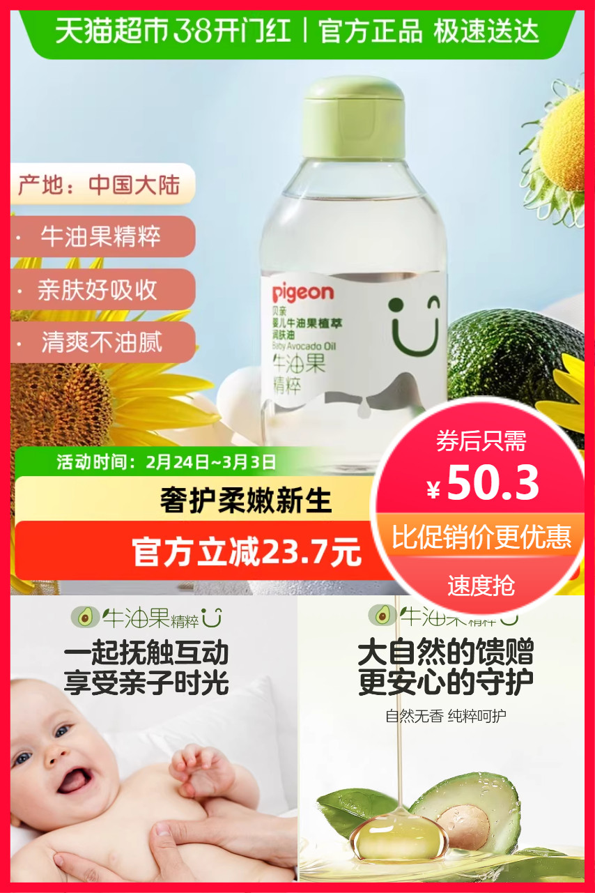 【红包+超市补贴+淘金币+VIP到手约44】Pigeon新生儿牛油果植萃润肤油,升级双重油粹,奢护柔嫩新生,无矿油矿脂,温和更安心,保湿不油腻,添加牛油果*乳木果油成分双重油粹,高保湿滋润,亲肤好吸收,清爽不油腻