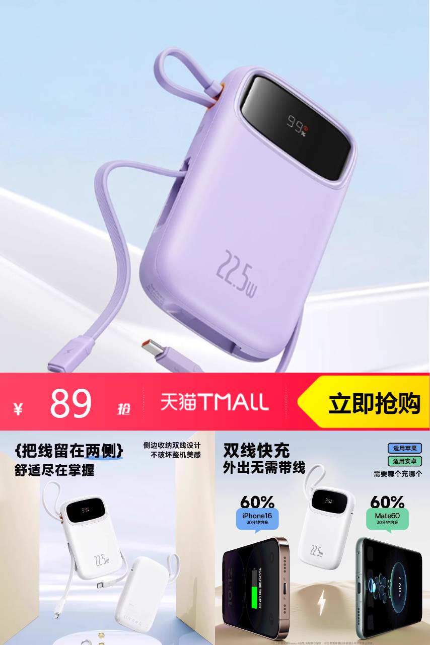 【原价99-立减10-88vip4.45-淘金币5.94-红包3.35=75.26到手】少带两根线插上即快充,自带苹果、安卓双快充线,一次解决不同手机快充问题~
