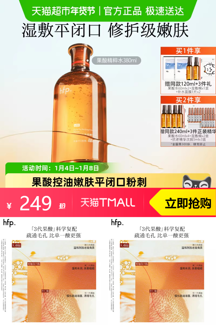 【1、拍就赠:果酸水60ml*2+湿敷棉*1+补水面膜1片*2 2、淘金币抵扣27.81+消费券抵扣20+立减5块+88vip12.45=178.74】hfp水润之选,酸精粹深补水!湿敷肌肤,水润倍增!糖酸爽肤,舒缓滋润!每日呵护,补水无忧!