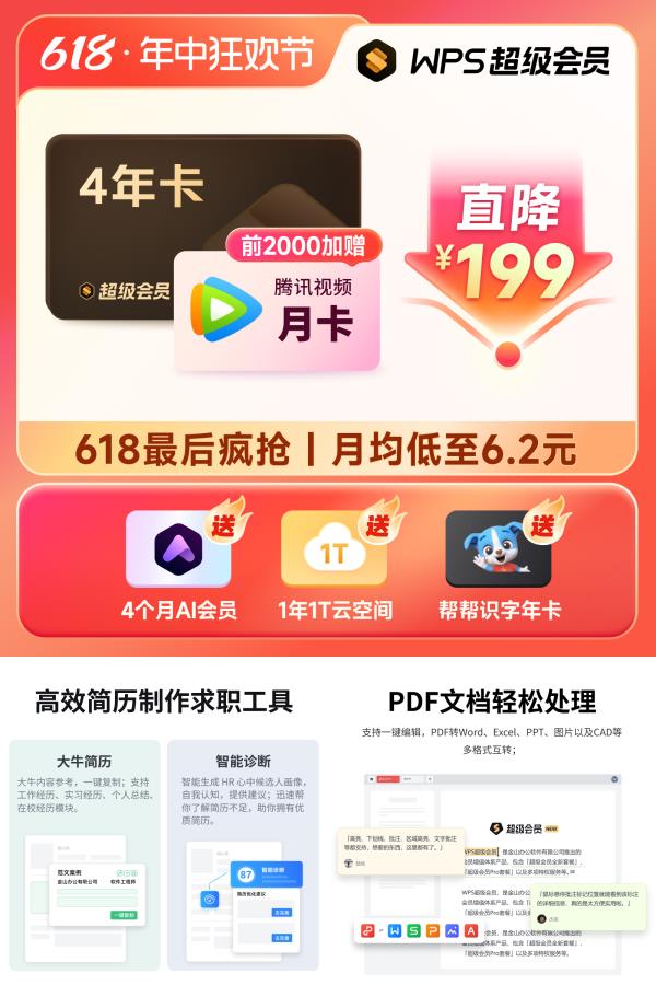 🌛今日特惠软件专享🌛 ------- 🎁【WPS超级会员】 领1.0亓优惠卷 买1件,领取满69减1优惠卷,参与全年下单再享9.5折,下单享优惠,淘金币可抵14.94元,折单件268.16 - 文字翻译 + 图片编辑 + PDF转PPT!!高效办公!功能全面!兼容性强!!4年使用权,官方正版,必备神器!!