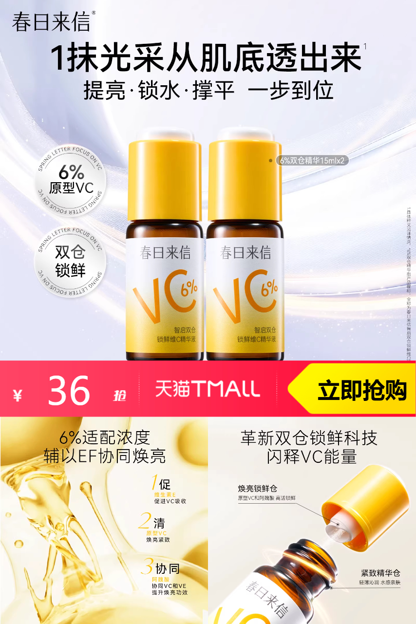 【到45%,淘金币抵扣1元到手35】春日来信6%VC精华液,革新双仓锁鲜科技,闪释VC能量,6%适配浓度,辅以EF协同焕亮,1抹光采从肌底透出来,提亮、锁水、撑平,一步到位~~