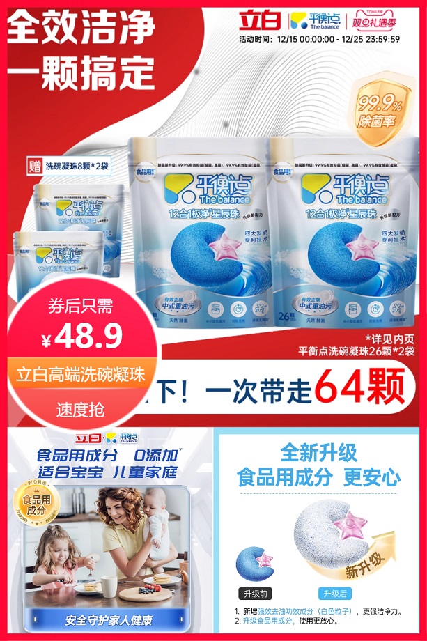 买就送送同款8颗*2袋,超级立减9元+券5元+点击右上角三个点进入淘金币抵扣10.69元后约38.21元,消费券+店铺限时红包后约38.21元,平衡点双腔极净12合1星辰洗碗凝珠26颗*3袋,高效去油,光亮无异味,天然酵素,食品级成分,无添加!