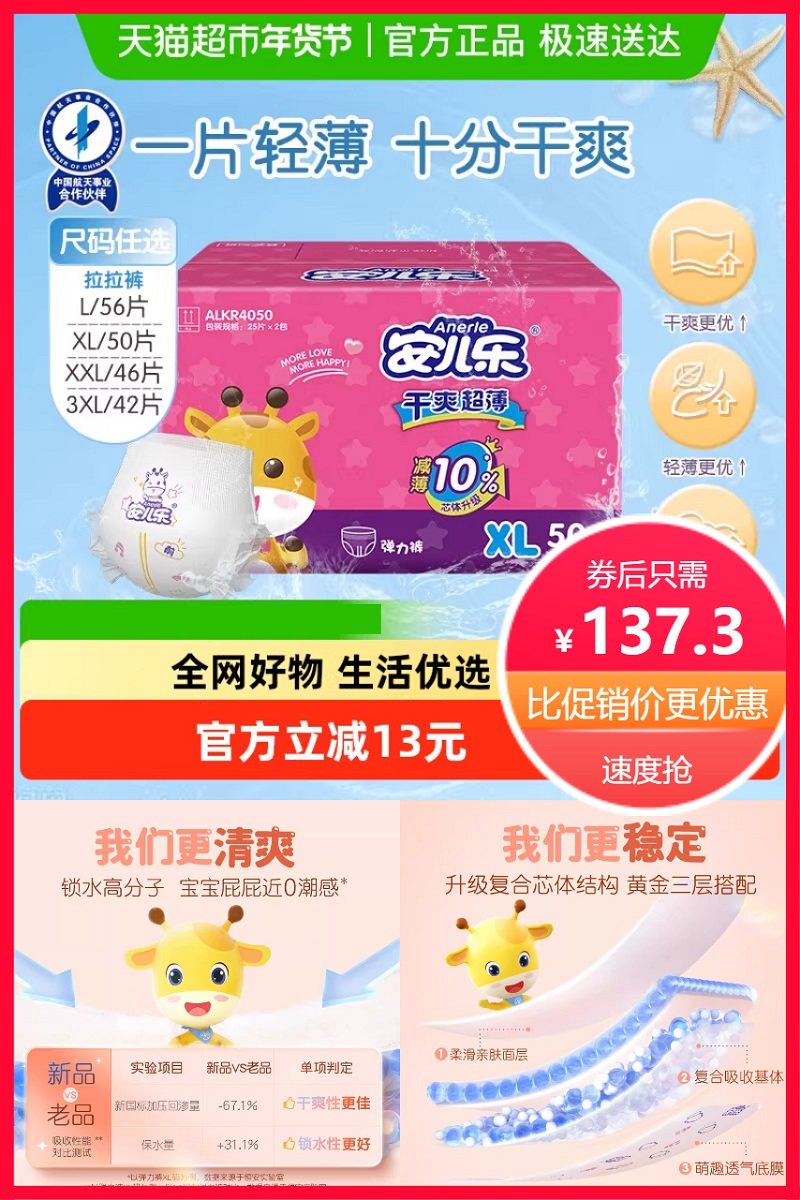 【拍3件淘金币+VIP+红包10元+VIP三件到手38.07/件,凑消费券到手更优惠!】安儿乐XL拉拉裤50片,一片轻薄,十分干爽,锁水高分子,宝宝屁屁近0潮感,柔滑亲肤面层,复合吸收基体,宝宝怎么动不怕!