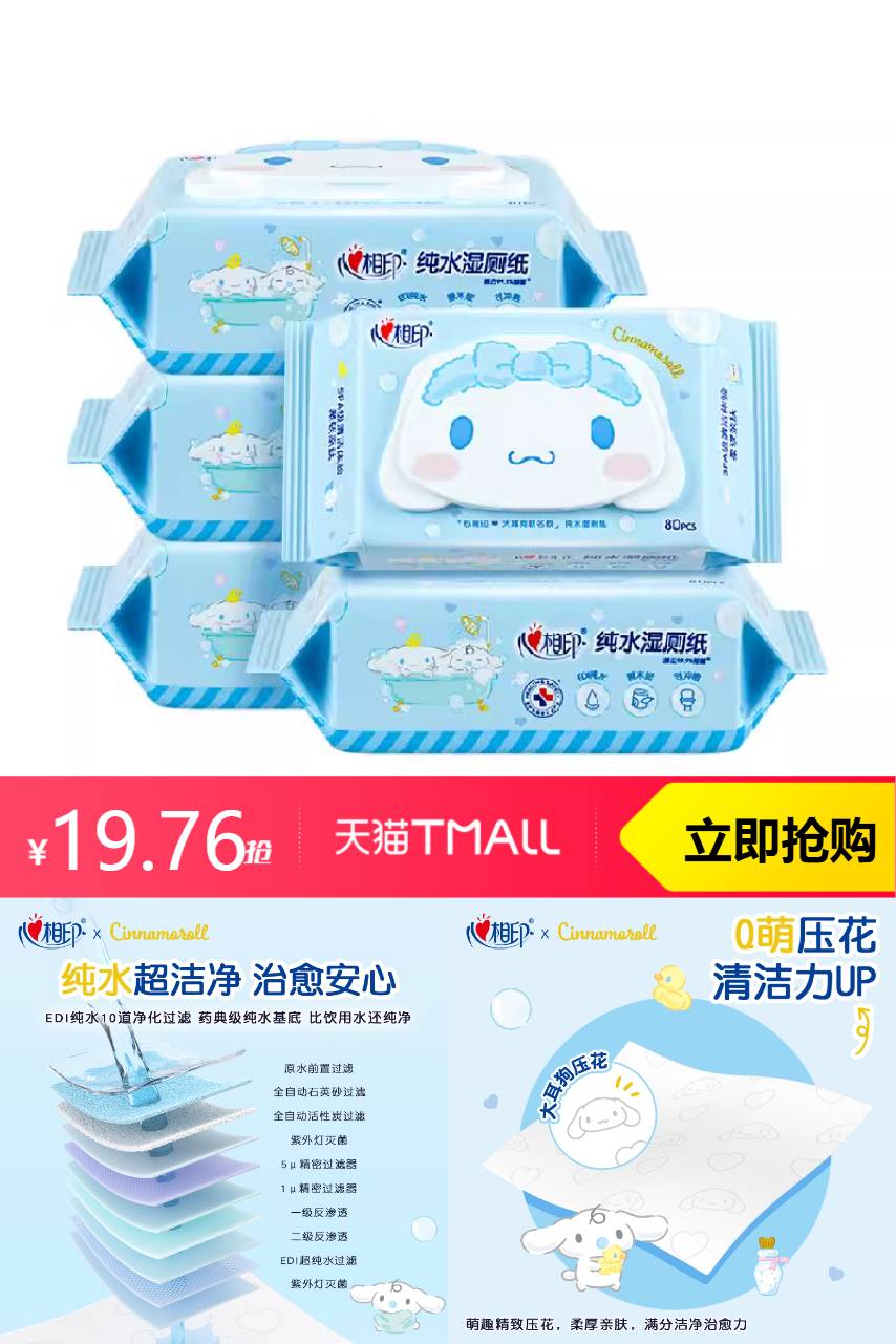 【立减31,下拉详情有品牌金5元,淘金币抵扣1,红包+9折券抵扣11.19,88vip抵扣1.95 总到手19.76】心相印三丽鸥/云熊湿厕纸80片*5包,品质保障,好用不易破!!